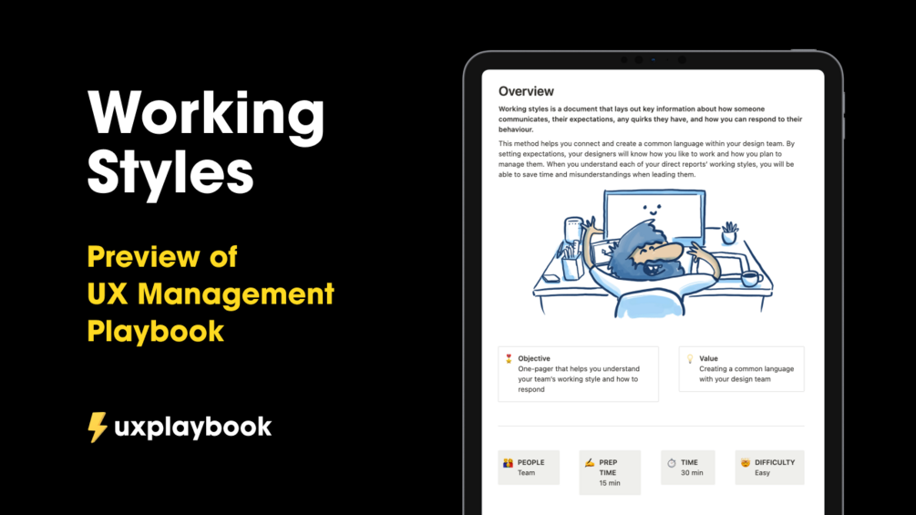 Connecting and creating a common language with your design team by creating this working styles document. By setting expectations, your designers know how you like to work and how you plan to manage them, they’re able to produce results faster. When you know how each of your direct report likes to work and communicate, you’re able to save time when setting direction and following up.